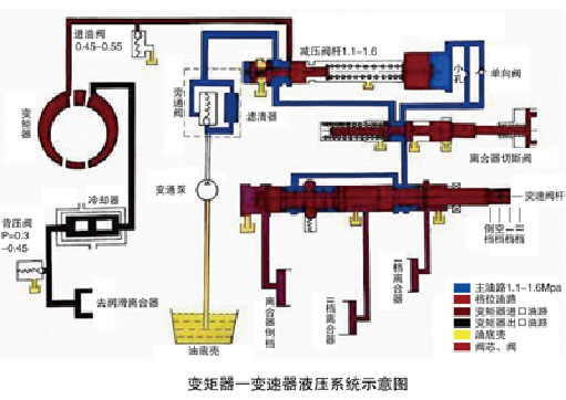(1)系統(tǒng)壓力不當(dāng)。調(diào)壓閥是液力傳動(dòng)系統(tǒng)的重要部件,它控制著進(jìn)入系統(tǒng)工作油的壓力。如果調(diào)壓閥閥芯磨損發(fā)生泄漏或者變矩器壓力閥失靈、卡滯,起不到調(diào)節(jié)作用,都會(huì)造成變矩器供油不足、壓力降低。